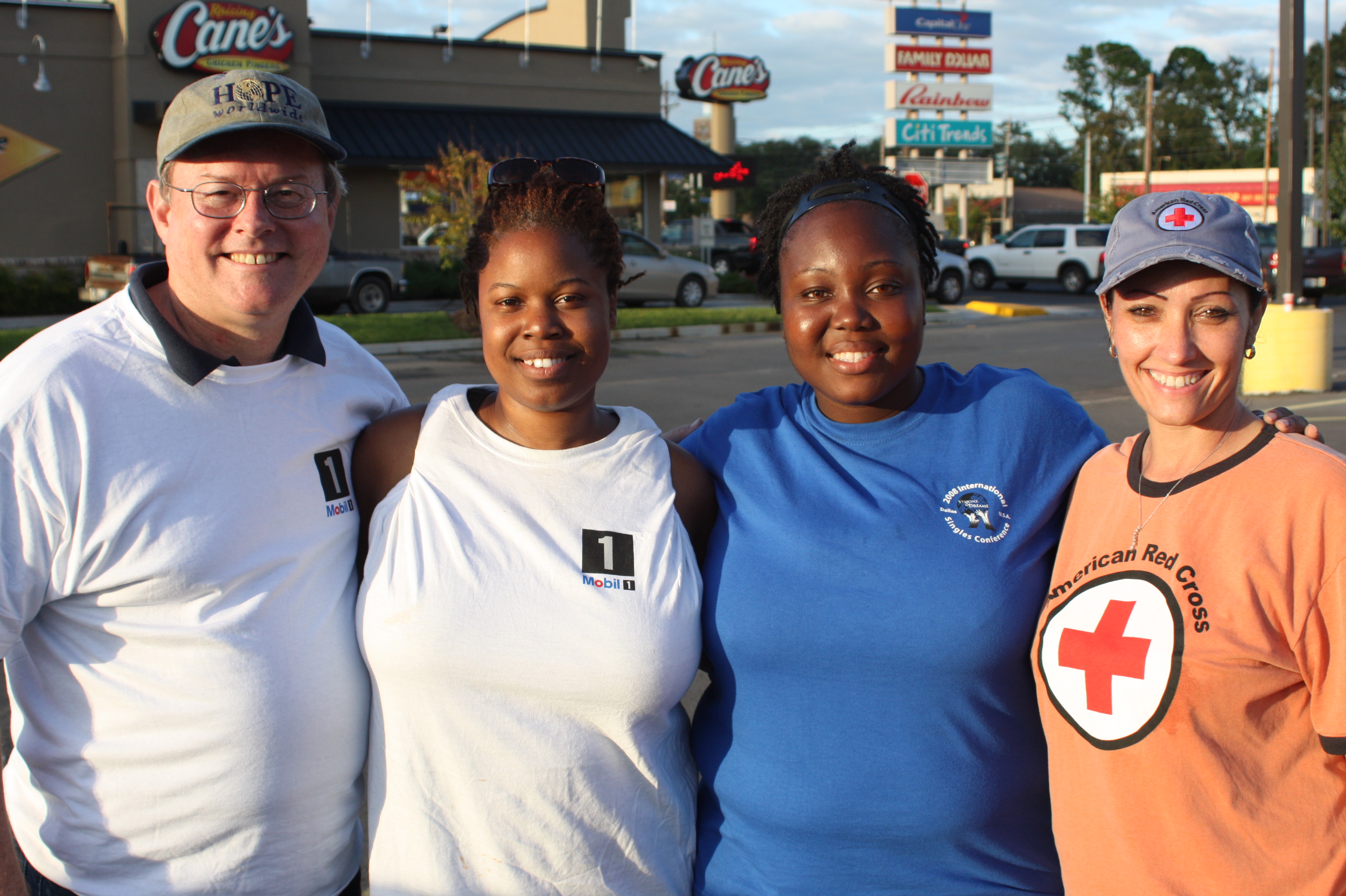 Leslie Moore, Chicago Church of Christ, Moji Owolabi, Kauai Church of Christ and Kathy Garrett, New York City Church of Christ heard the appeal at the International Singles Conference (ISC), changed their plans, served in the Dallas shelter and then came to Baton Rouge to help. They are seen in this photo being thanked by Randy Jordan, CEO of HOPE worldwide.
